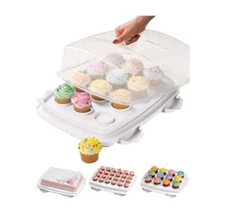 Este molde de silicona para cupcakes en forma de taza me parece una pasada, por no hablar del "simple" cuenco rosa con brocados. También me parece bastante útil el transportador para cupcakes, todo un inventazo.